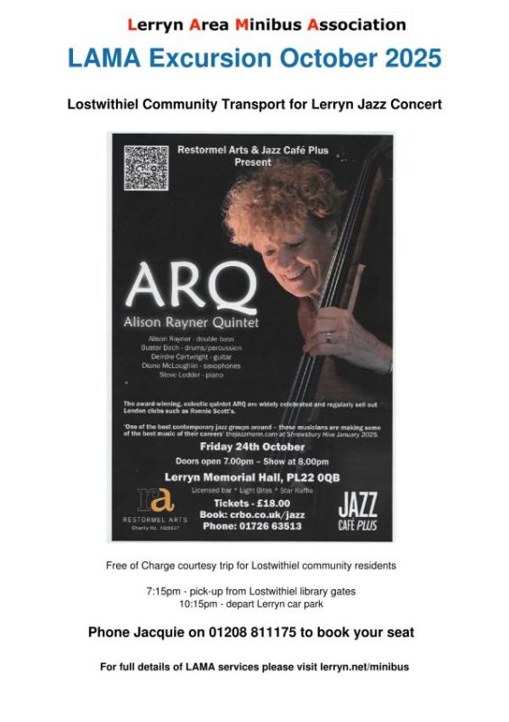 LAMA is providing a free of charge courtesy trip to take Lostwithiel community residents to the ARQ jazz concert in Lerryn Memorial Hall. The minibus will pick-up from Lostwithiel library gates at 7:15pm... Read more
