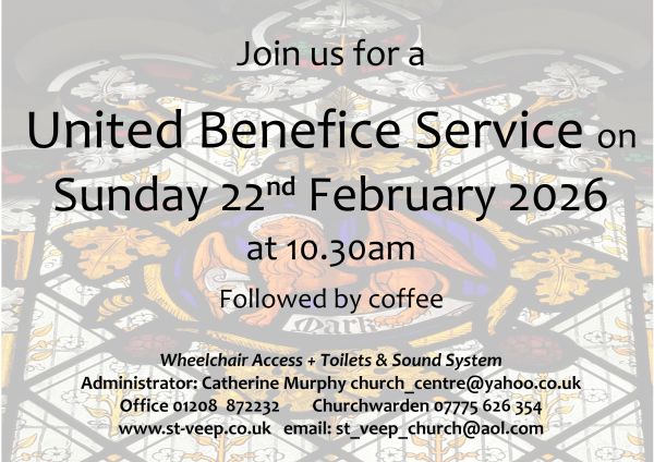United Benefice Service at St Veep Church Sunday 22nd February at 10.30am Everyone is warmly invited to join us at St Veep Church for our United Benefice Service on Sunday 22nd February at 10... Read more